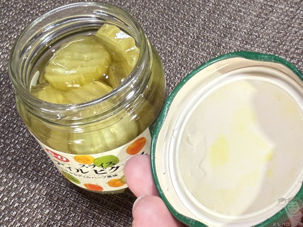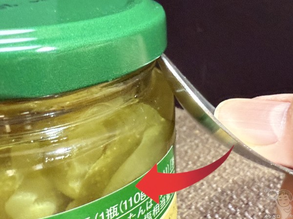 ピクルスなどと同系統の商品は大体外気圧と内気圧の差で開かないことが大半なので、この方法をやれば一発で開く。