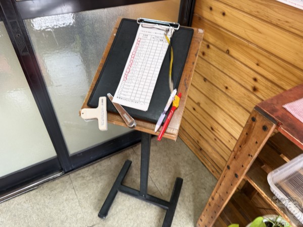 ・風防室内に記帳簿があるので「氏名」「人数」「希望の席」を記入する。 - 案内されたら席に座り口頭にて注文