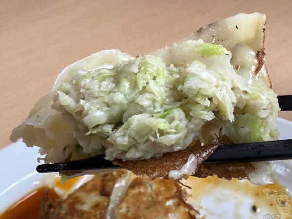 中はキャベツなどの野菜たっぷりでシャキシャキとした食感のアクセントが心地よい。