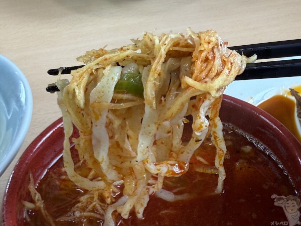 佐野ラーメンならではの不揃い感が食感にアクセントを与え、スープの絡みよく啜るたびにガツンと刺激が襲ってくる。