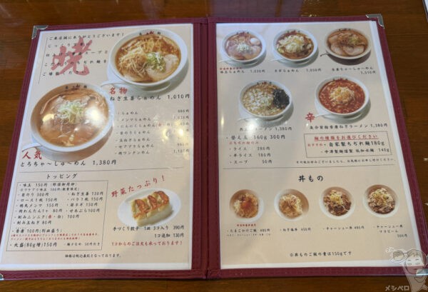 佐野ラーメンを看板メニューとし名物ねぎ生姜らぁめんをはじめ、にんにくらぁめん、セアブラらぁめんなどのハイブリット系佐野ラーメン、さらに燕三条ラーメンや辛い系ラーメンなどが味わえる。