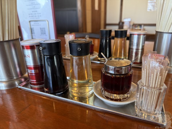 卓上調味料は、ホワイトペッパー・醤油・酢・ラー油・七味唐辛子。