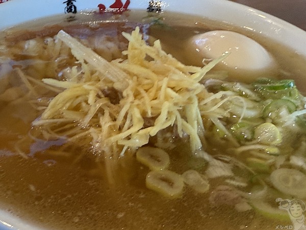トッピングは、きざみネギ、針生姜、味玉、バラチャーシュー1枚、ロースチャーシュー1枚。