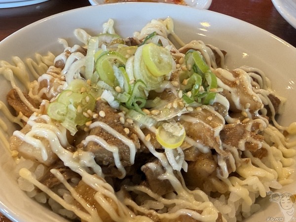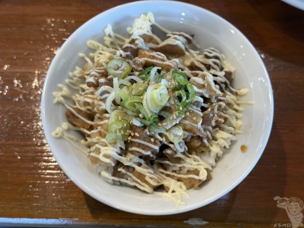 ご飯の上にカットチャーシューがゴロゴロと、マヨビームでジャンクな雪化粧。