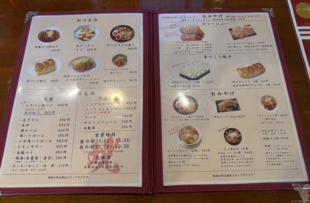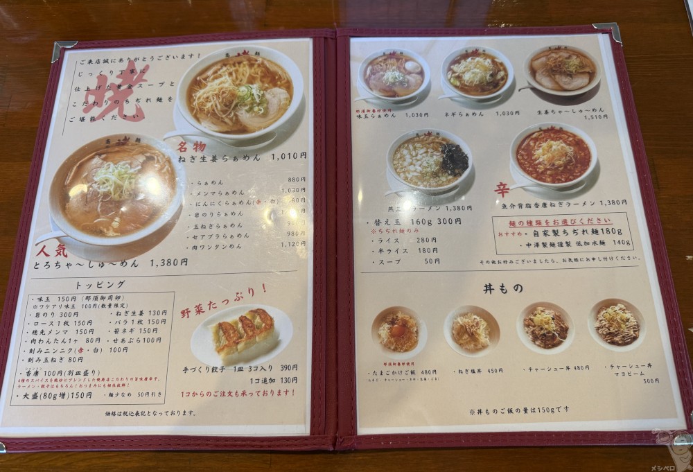 佐野ラーメンを看板メニューとし名物ねぎ生姜らぁめんをはじめ、にんにくらぁめん、セアブラらぁめんなどのハイブリット系佐野ラーメン、さらに燕三条ラーメンや辛い系ラーメンなどが味わえる。