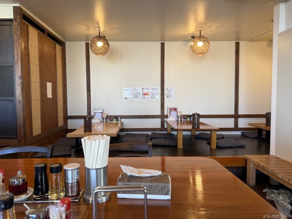 正面奥の小上がりには4人掛けの座卓が3卓。