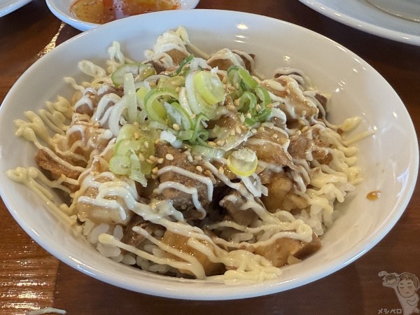 ご飯の上にカットチャーシューがゴロゴロと、マヨビームでジャンクな雪化粧。
