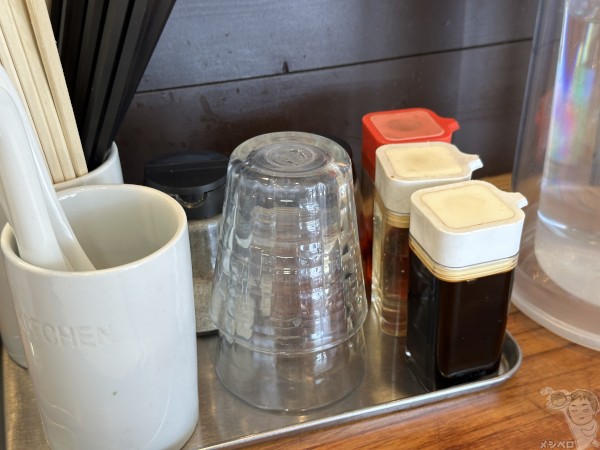 卓上調味料は、醤油・酢・ラー油・粗挽き胡椒など。