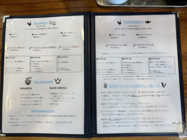 淡麗系を主体とした独創的なメニューが多く、県内でいち早く『昆布水つけめん』の提供を開始した県内普及の先駆け的な存在。