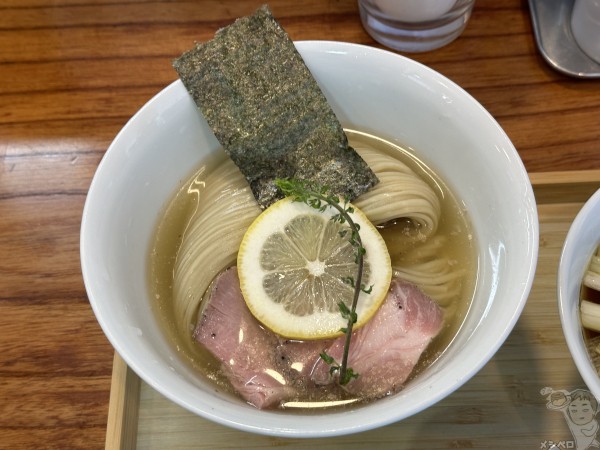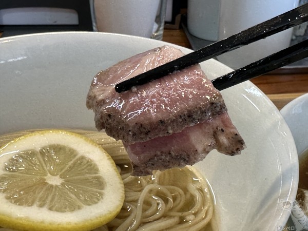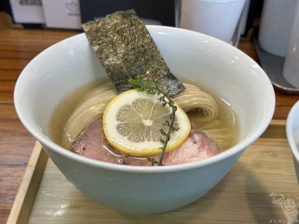 トッピングは肩ロースの低温レアチャーシュー、スライスレモン、海苔、穂紫蘇。