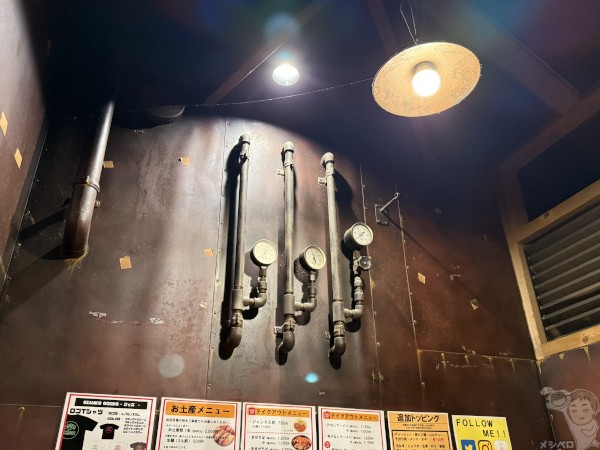 室内は木造だが鉄板を打ちつけたような壁面に剥き出しのパイプ、トレロ感あるペンダントライトなど雰囲気満点。