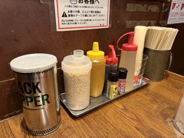 卓上調味料は、ブラックペッパー・フライドガーリック・一味唐辛子・カエシ・酢・マヨネーズ・カレー粉・花椒。