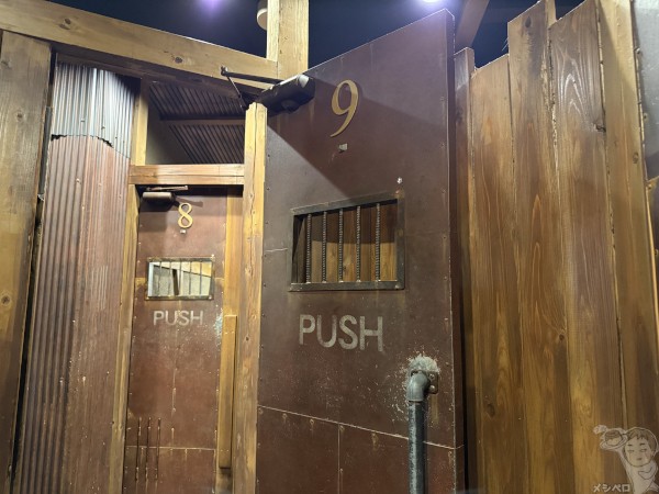 鉄格子の小窓のついた鋼鉄製を彷彿させる個室扉は監獄の独房を彷彿させる。