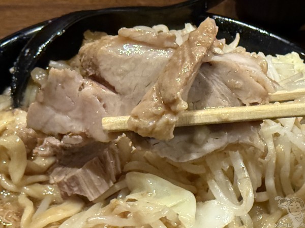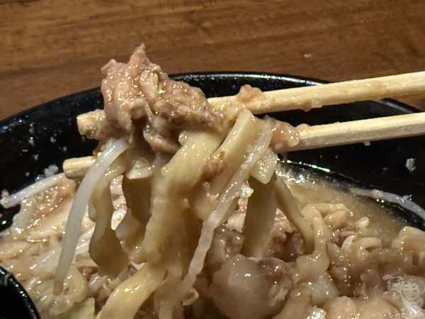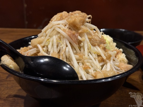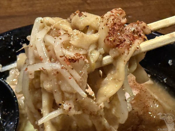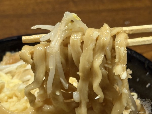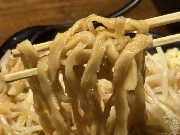 極太のオーション麺で、ワシワシとしたコシの強い食感が食べ応えあり、体感的に麺量300g以上にも感じるほど。