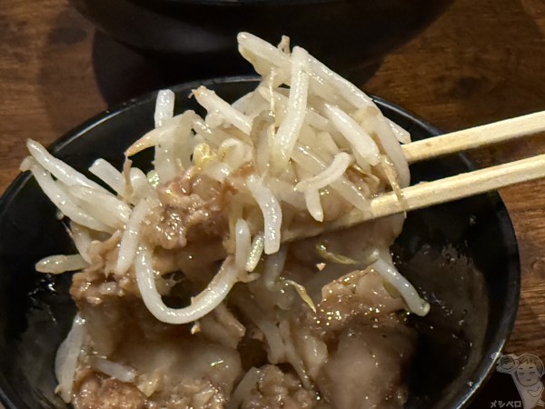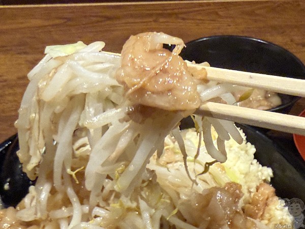 味付けアブラは醤油ダレの風味を吸収したコクと甘み感じる濃厚な味わいで、程よい塩味も相まってヤサイの旨みを引き立てる。