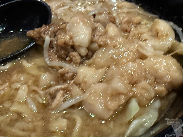 味付けアブラは醤油ダレの風味を吸収したコクと甘み感じる濃厚な味わいで、程よい塩味も相まってヤサイの旨みを引き立てる。
