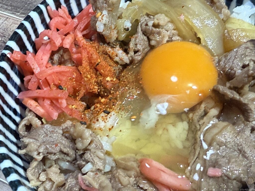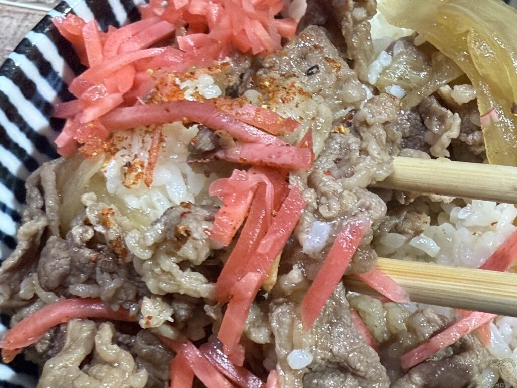 紅生姜の酸味と塩気、七味唐辛子のピリリとした辛さと香りのエッセンスがより吉野家感を際立たせる。