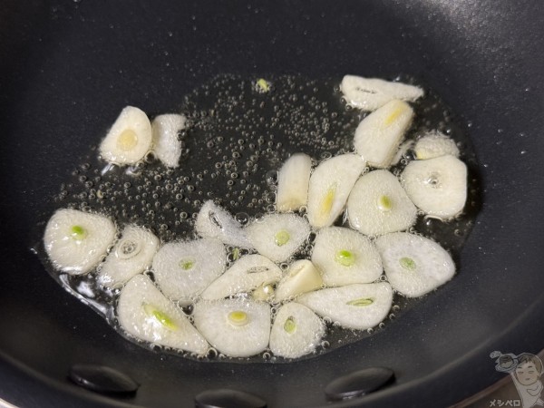 フライパンに油(大さじ1)とスライスしたニンニクを加え、火をつけて弱〜中火で香り立つまで炒める。