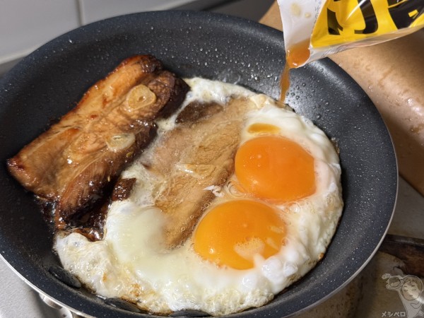 卵がお好みの固さになったら、フライパンの側面に袋に余っていたタレを加える。