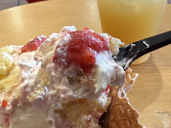 スイートクリームアイスクリームをベースに、ストロベリー、スポンジケーキ、ホイップクリームをミックスインした一品。