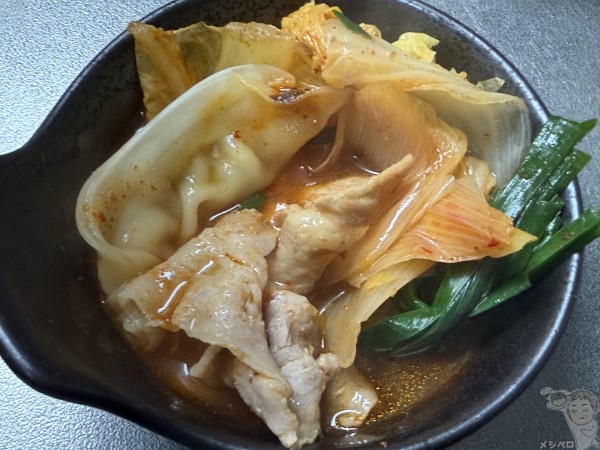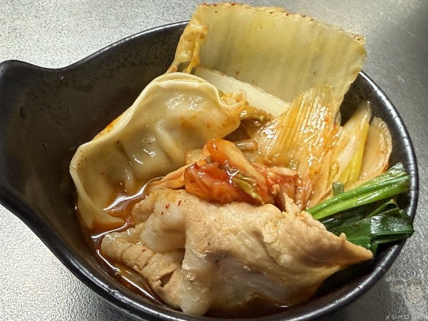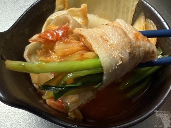 真っ赤な見た目に反してピリ辛程度でコチュジャンのコクと赤唐辛子の辛味のアクセントが秀逸、それでいて牛出汁の旨みに豚バラの旨み溶け出し野菜の甘み相まってマイルドな味わい。