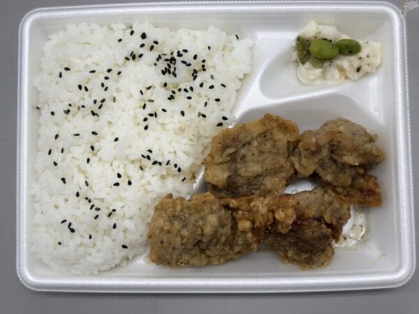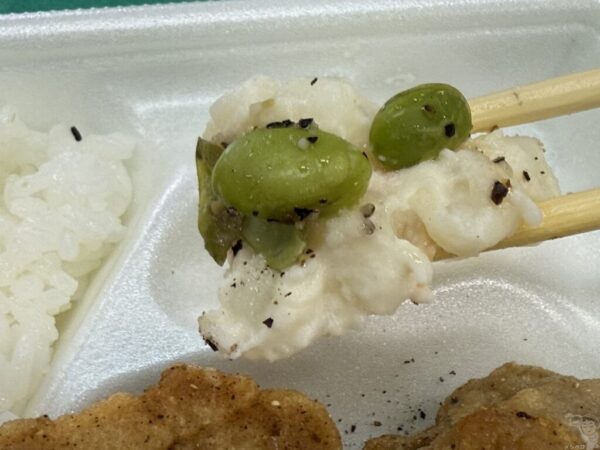 ご飯は王道のふりゴマ、ポテトサラダにはにくにく風味枝豆炒めが添えられている。