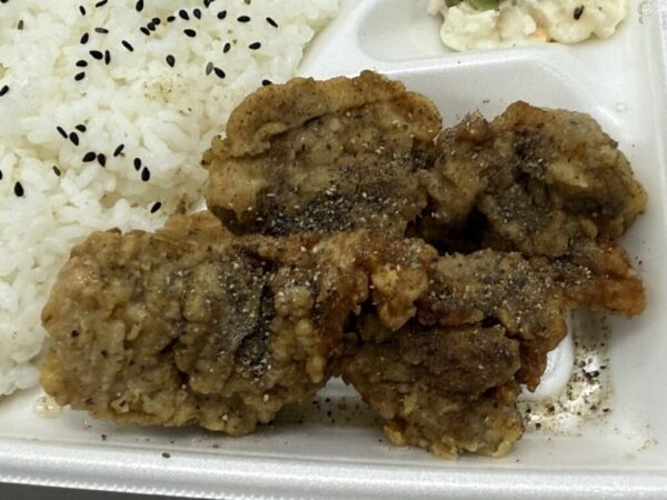 メインは唐揚げ4個、ガロニ無しだが、容器に溝があるので唐揚げから溢れた油がちゃんと取り除かれている。
