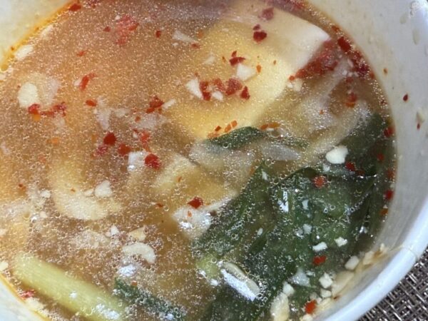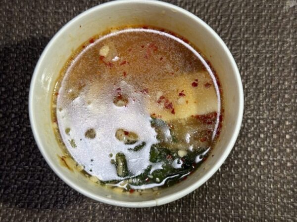 程よい酸味、ニンニクと唐辛子の風味に一瞬台湾ラーメンがフラッシュバックする。