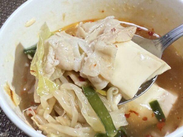 具材は大ぶりな豆腐にニラ、もやし、キャベツ、豚肉とボリューミーで食べ応え満点。