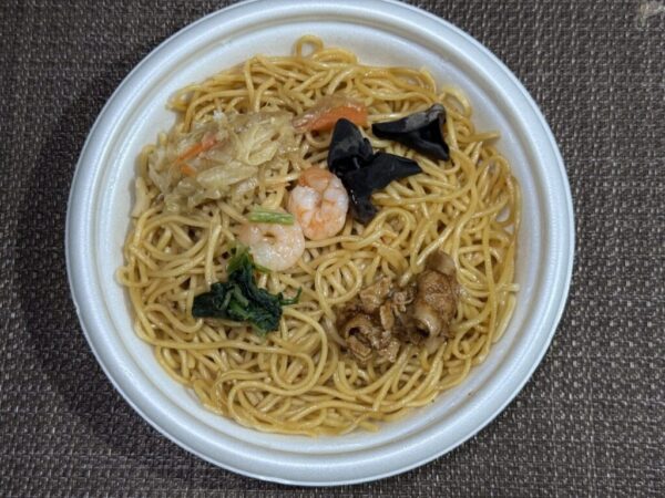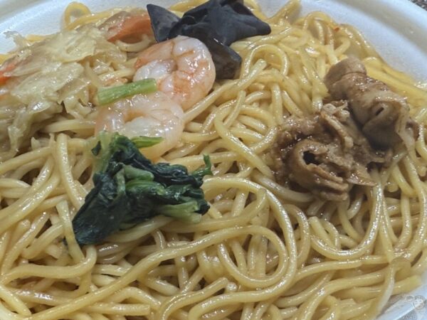 具材はキャベツ・玉ねぎ・にんじんを炒めたもの、豚肉炒め、ゆできくらげ、ゆでほうれん草、ゆでえびと贅沢。