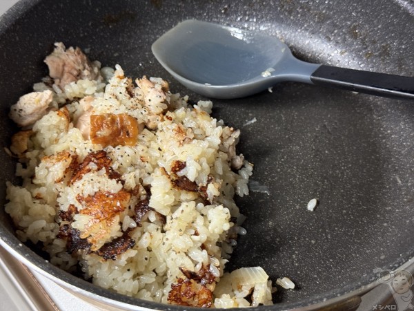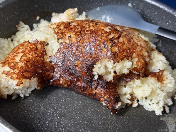 皮目を香ばしく焼いた鶏肉香ばしさと旨み溶け出し、フライパンじゃないとできない米の焦げ感が最高のエッセンスにきいていて旨みのポテンシャルが何倍にも跳ね上がる。