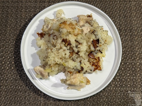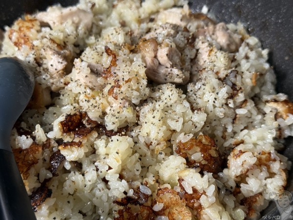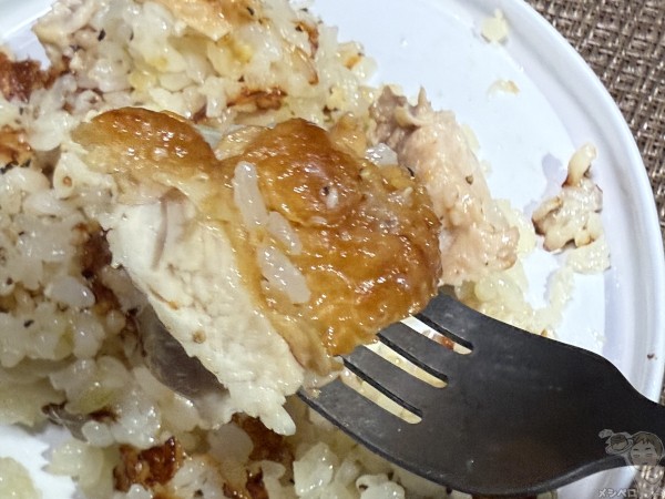 しっかり皮目を焼いた鶏肉、おこげのできた米の香り、黒胡椒のスパイシーな香りがミックスした芳醇な香りを纏った湯気漂う。
