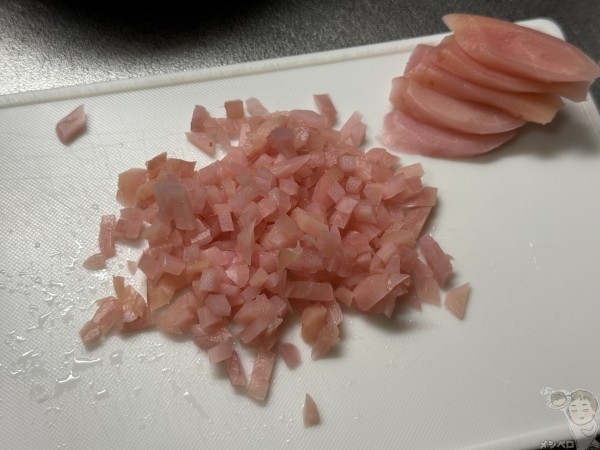 - 岩下の新生姜スライスを5枚残して、みじん切りにする