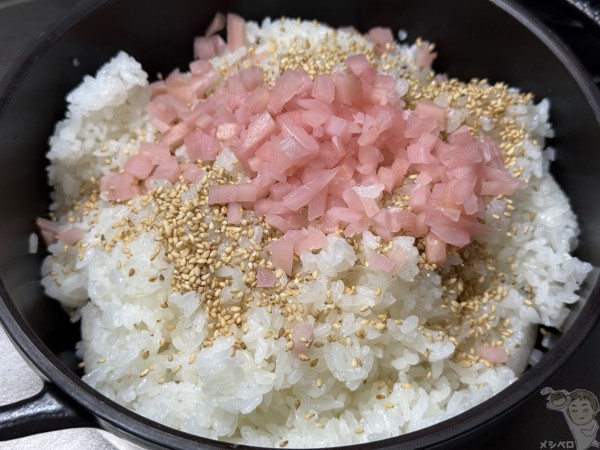炊き立てご飯にみじん切りにした岩下の新生姜スライス・アジシオ(小さじ1)・白いりごま(大さじ2)をよく混ぜ込む。