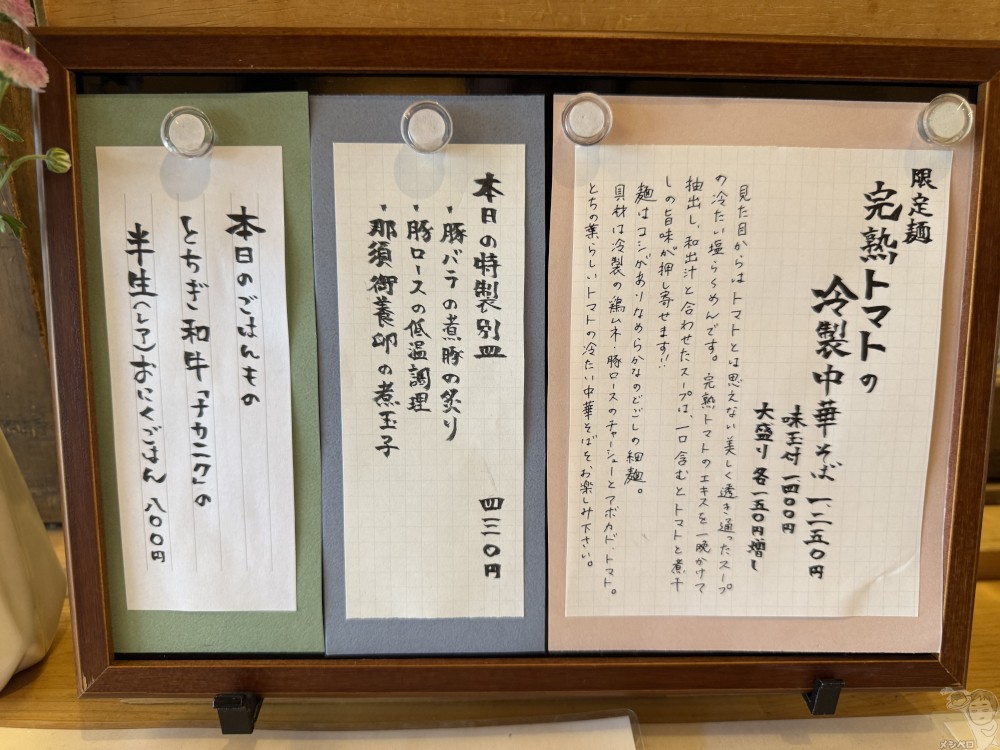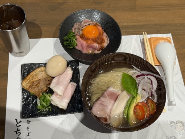 これが今回味わう夏季限定メニュー『完熟トマトの冷製中華そば』+本日の特製別盛+本日のごはんもの『栃木和牛「ナカニク」の半生おにくごはん』。