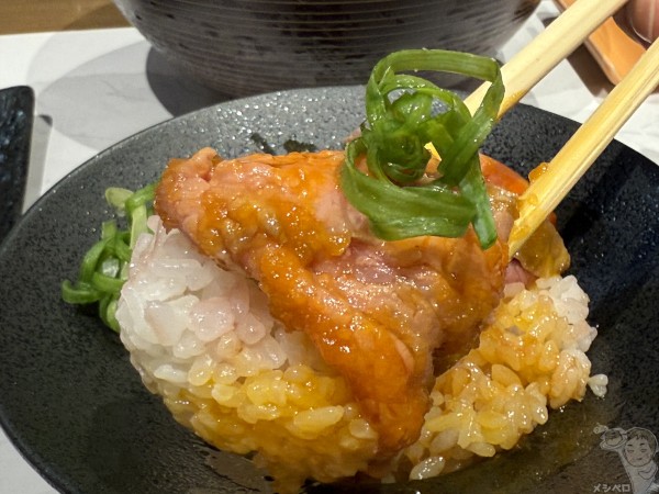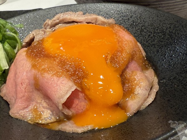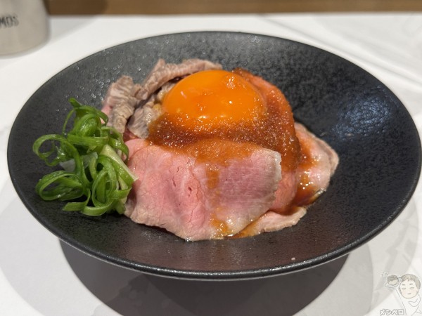ご飯を包み込む和牛ソトモモのレアチャーシュー、中央には卵黄。