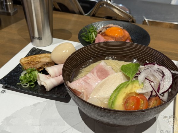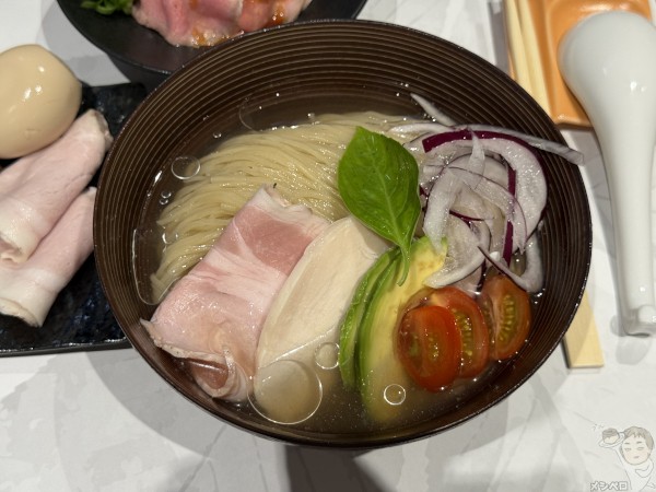 トッピングはレアチャーシュー、鶏チャーシュー、スライスしたアボカド・ミニトマト・アーリーレッド、バジルの葉が添えられている。