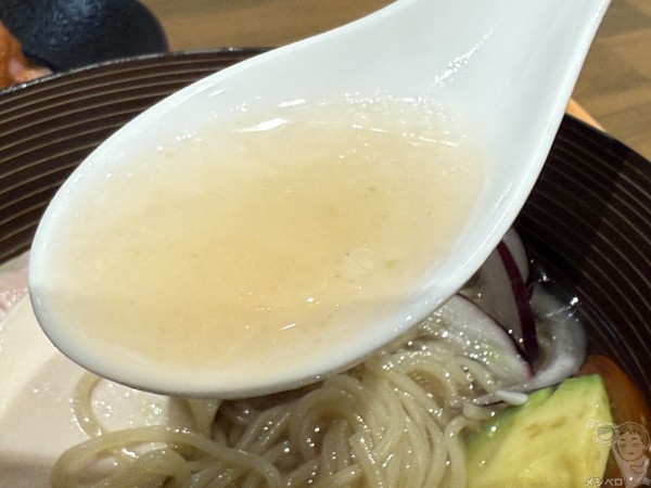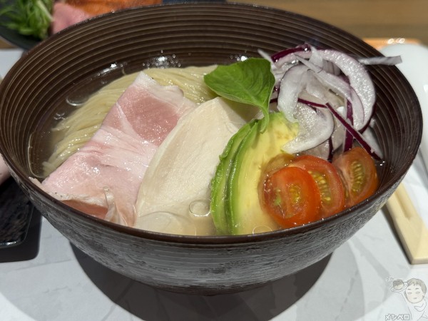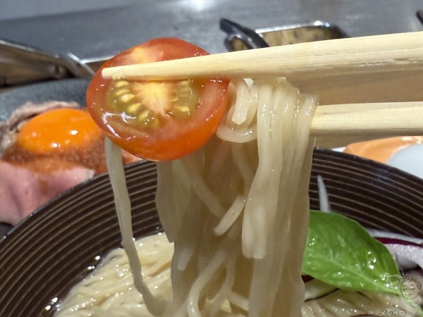 透明なスープから想像もできない、トマトの風味と煮干しや昆布の出汁感きいた淡麗スープが特徴的な冷製ラーメンだ。