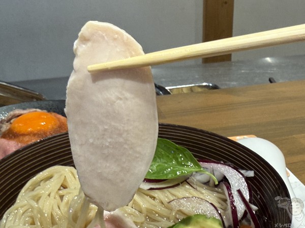 鶏チャーシューはなめらかな口当たりで、濃厚な鶏の旨みを感じる。