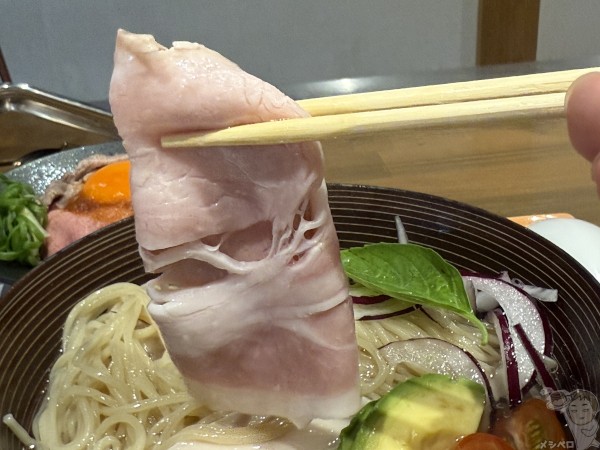 レアチャーシューはシルキーな口当たりで、あっさりスープとの相性も抜群。
